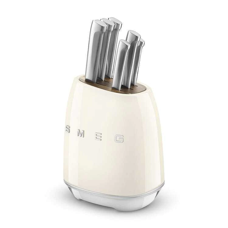 El bloque cuenta con ranuras interiores de madera de acacia natural, que protegen las hojas y aportan un acabado elegante. Su cuerpo de acero inoxidable color crema con terminación brillante, junto a la base con acabado cromado, refuerzan la inconfundible estética SMEG 50’s Style, convirtiéndolo en un verdadero objeto decorativo para la cocina.
